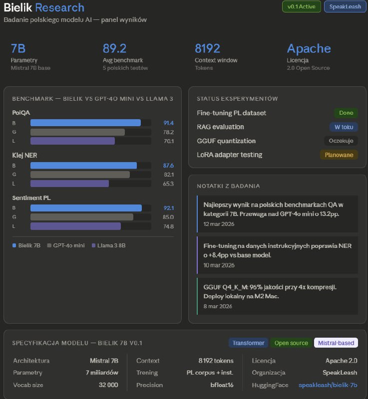 Dashboard badawczy do benchmarkingu polskiego LLM Bielik 7B. Porównania z GPT-4o mini i Llama 3 8B, tracking eksperymentów fine-tuningu, RAG ewaluacji i kwantyzacji.
