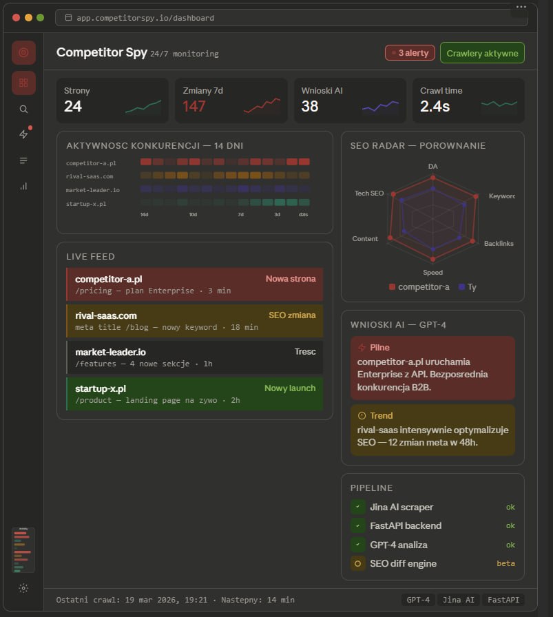 Platforma SaaS do analizy konkurencji z GPT-4. Monitoring SEO, cen i słów kluczowych w czasie rzeczywistym. Dashboard z alertami — reagujesz szybciej niż konkurencja.
